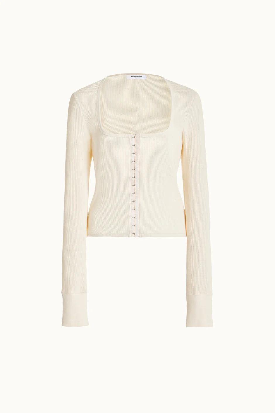 Our take on an all weather long sleeve cardigan with a sweetheart neckline; accentuating the décolletage and beautifully framing the collarbones and upper chest. The hook & eye clasp detailing allows for versatile styling, wear it by itself or as a layering piece. The breathable, 100% organic cotton waffle knit washes better for wear and can be worn daily all year round - the perfect transitional piece. Cozy, sexy and ready for anything - from a picnic in the park to another first date.
