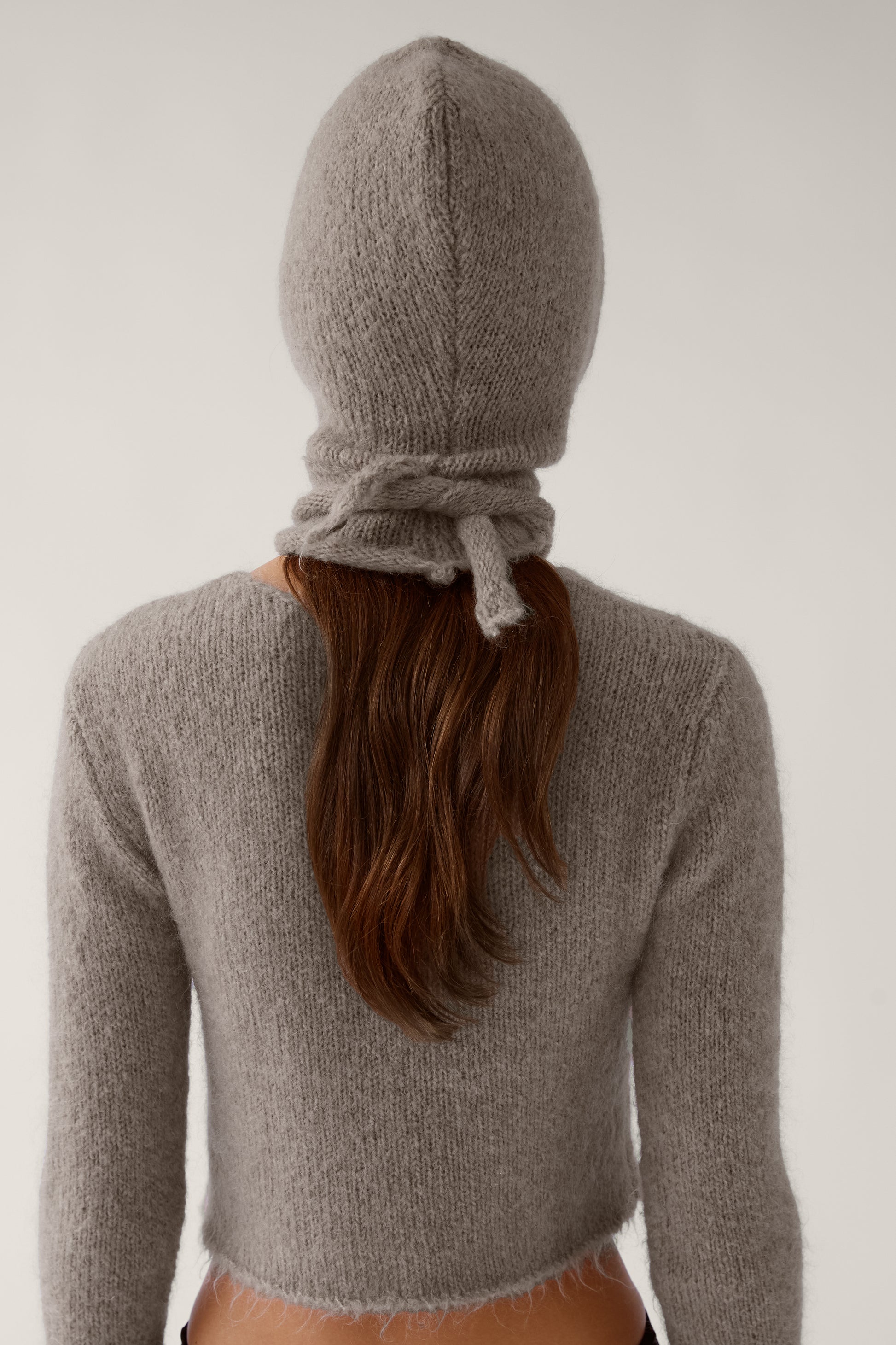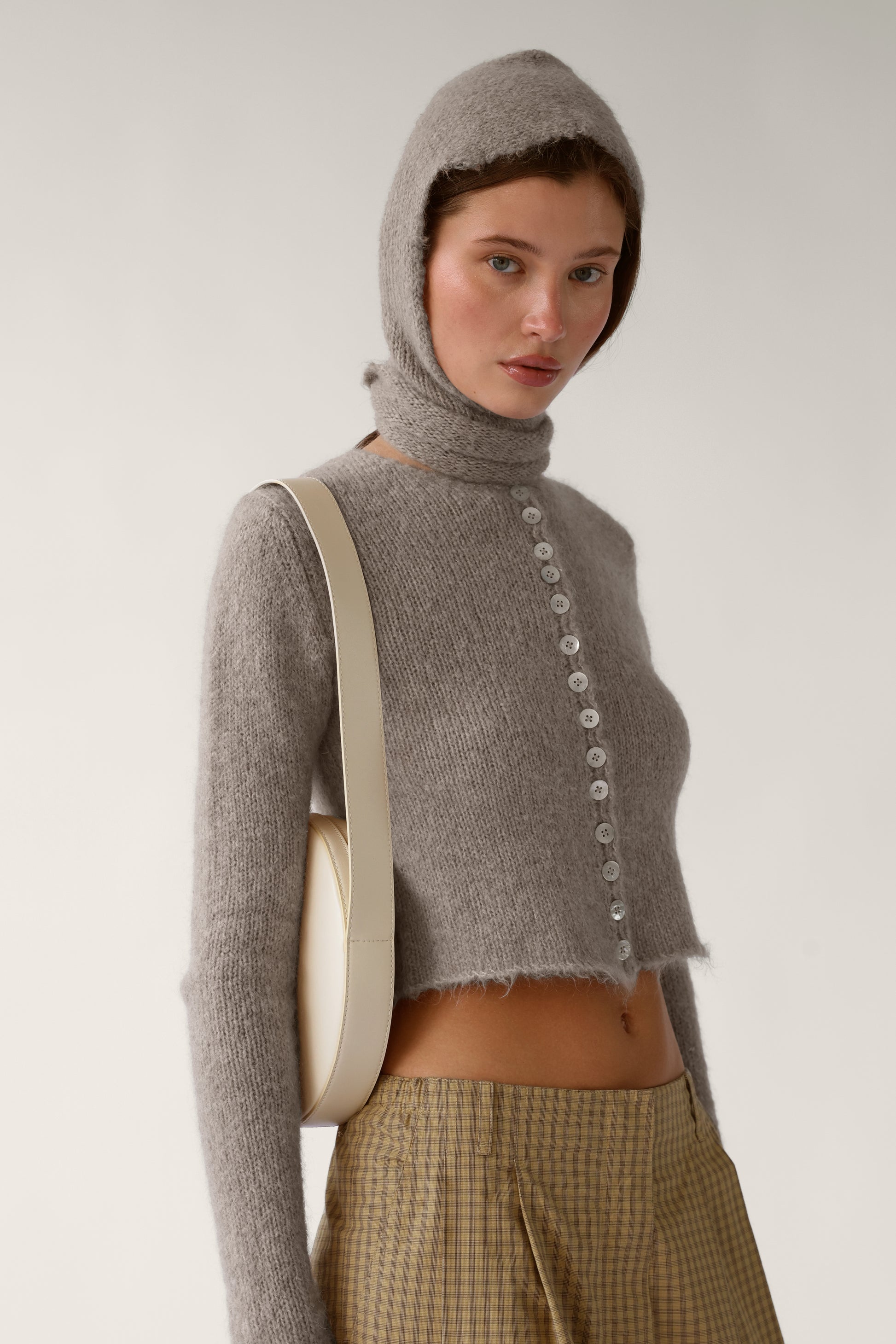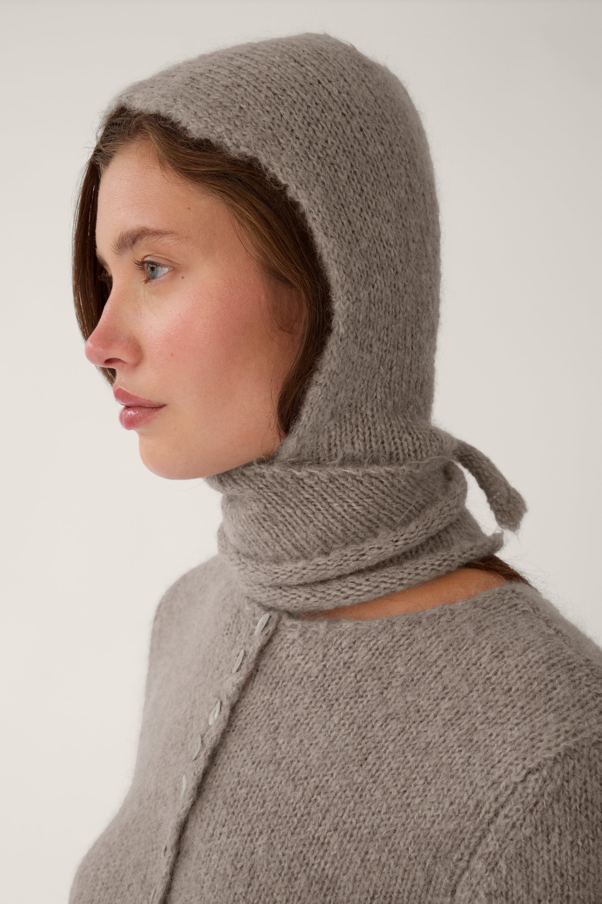 A delicate finishing touch to pair with the Mary Jane Cardigan. Crafted from the same mohair and dainty mother of pearl button. A knitted Responsible Wool Standard-certified wool blend, the Mary Jane Headscarf offers soft texture and effortless elegance in new color, Stone. Its shroomy-brown hue makes it a cool-weather staple, endlessly timeless, and wearable, as well as a perfect neutral hue for your winter wardrobe.