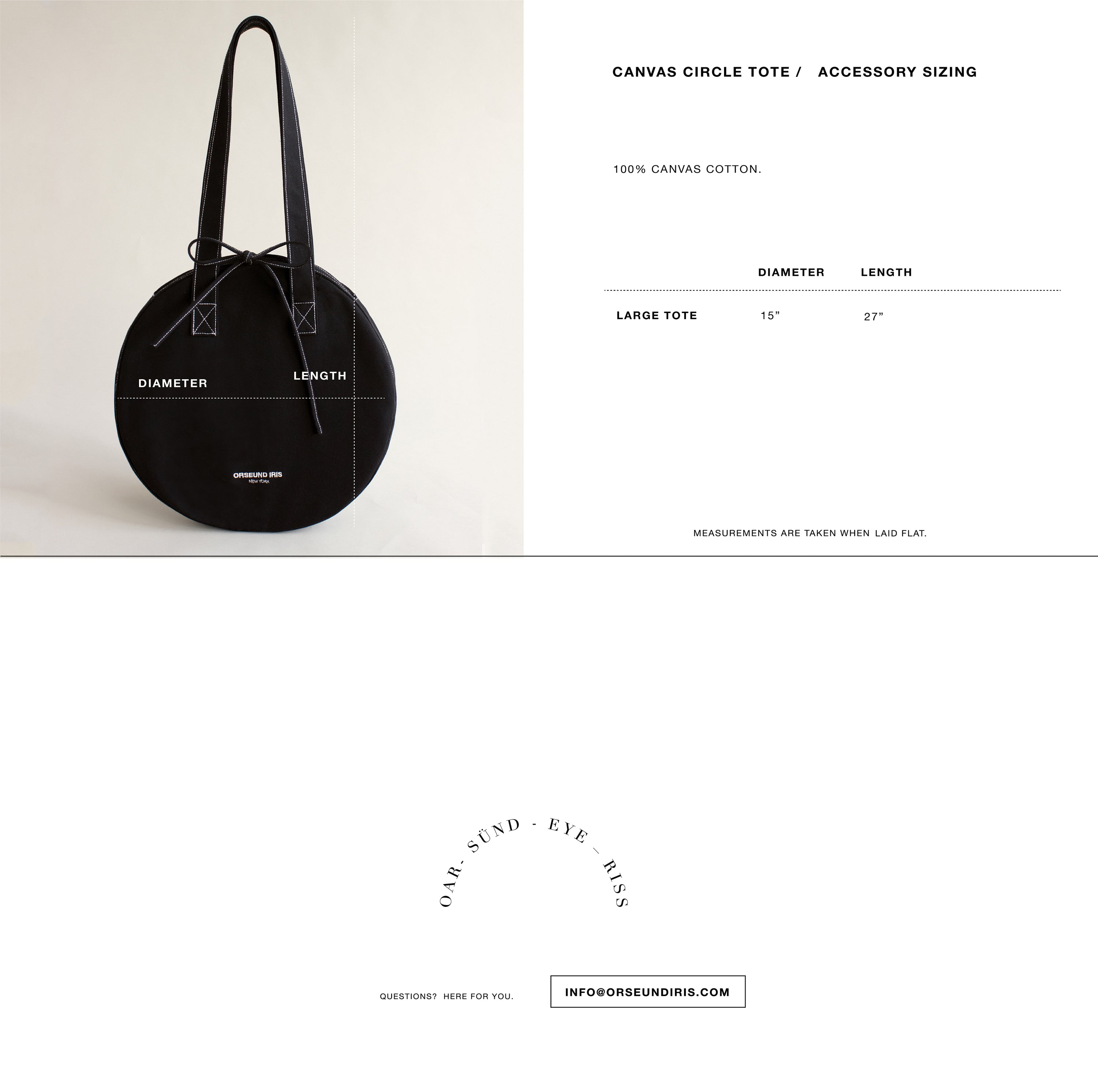 Orseund Iris signature Canvas Circle Tote with contrast top-stitch. Constructed with heavy-weight canvas and an interior binding for extra structure. Interior pocket to carry your essentials. Embroidered Orseund Iris logo at center front. Finished with a coating to repel dust and dirt. Resistant to some lint and fading. 15" diameter.