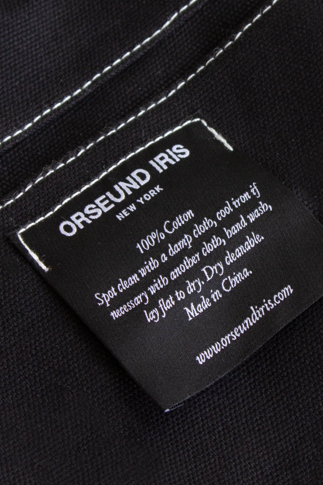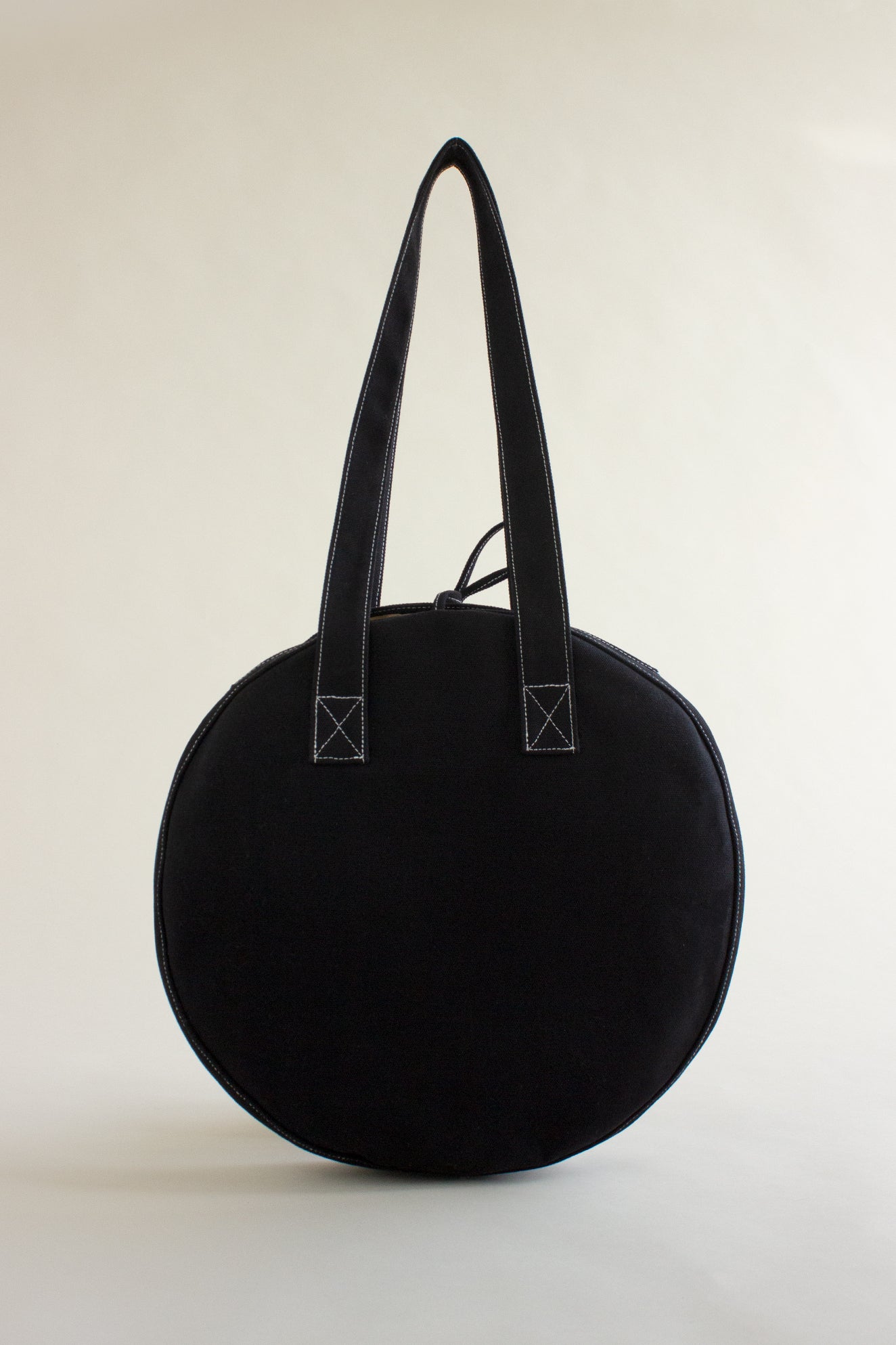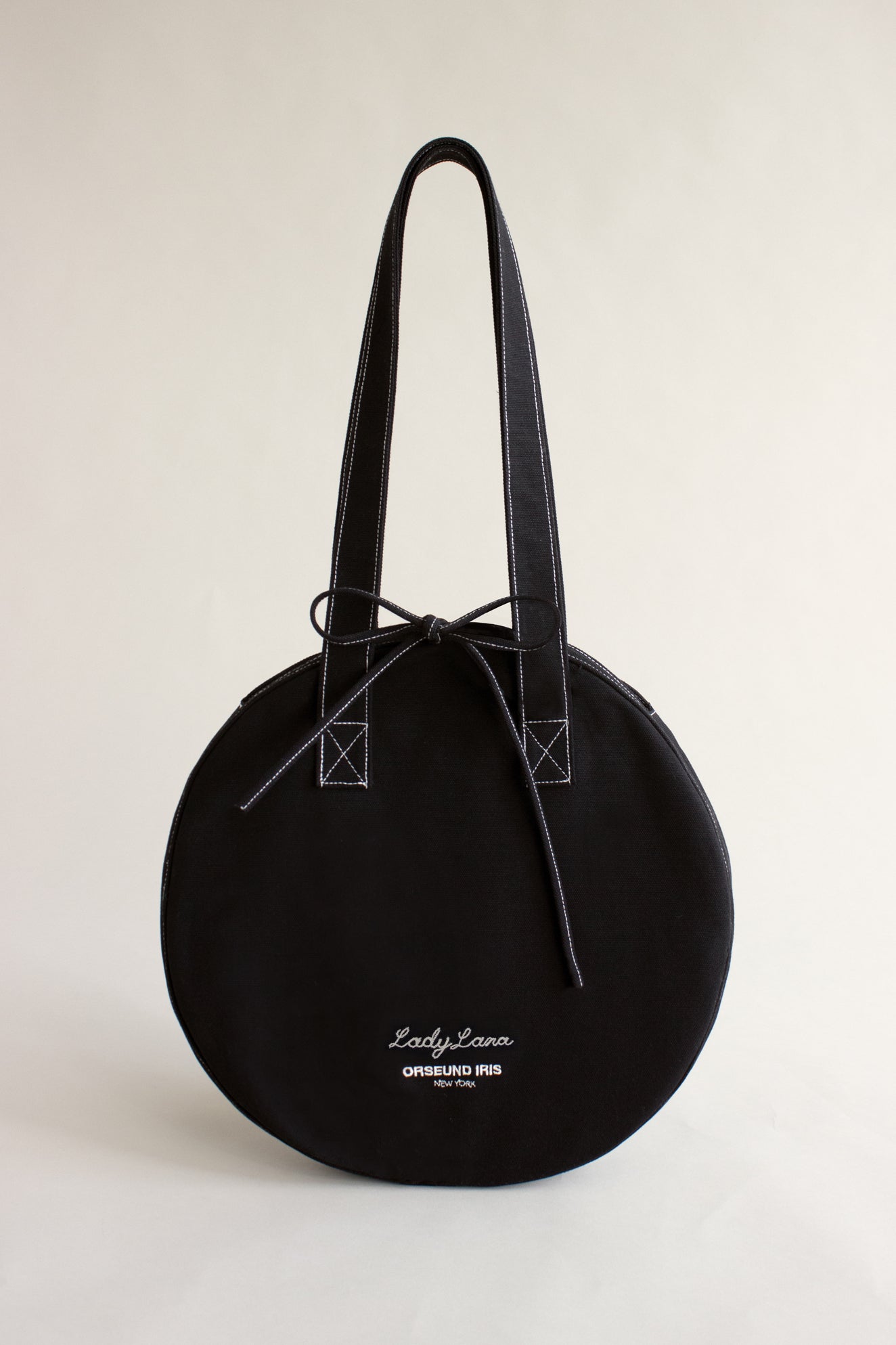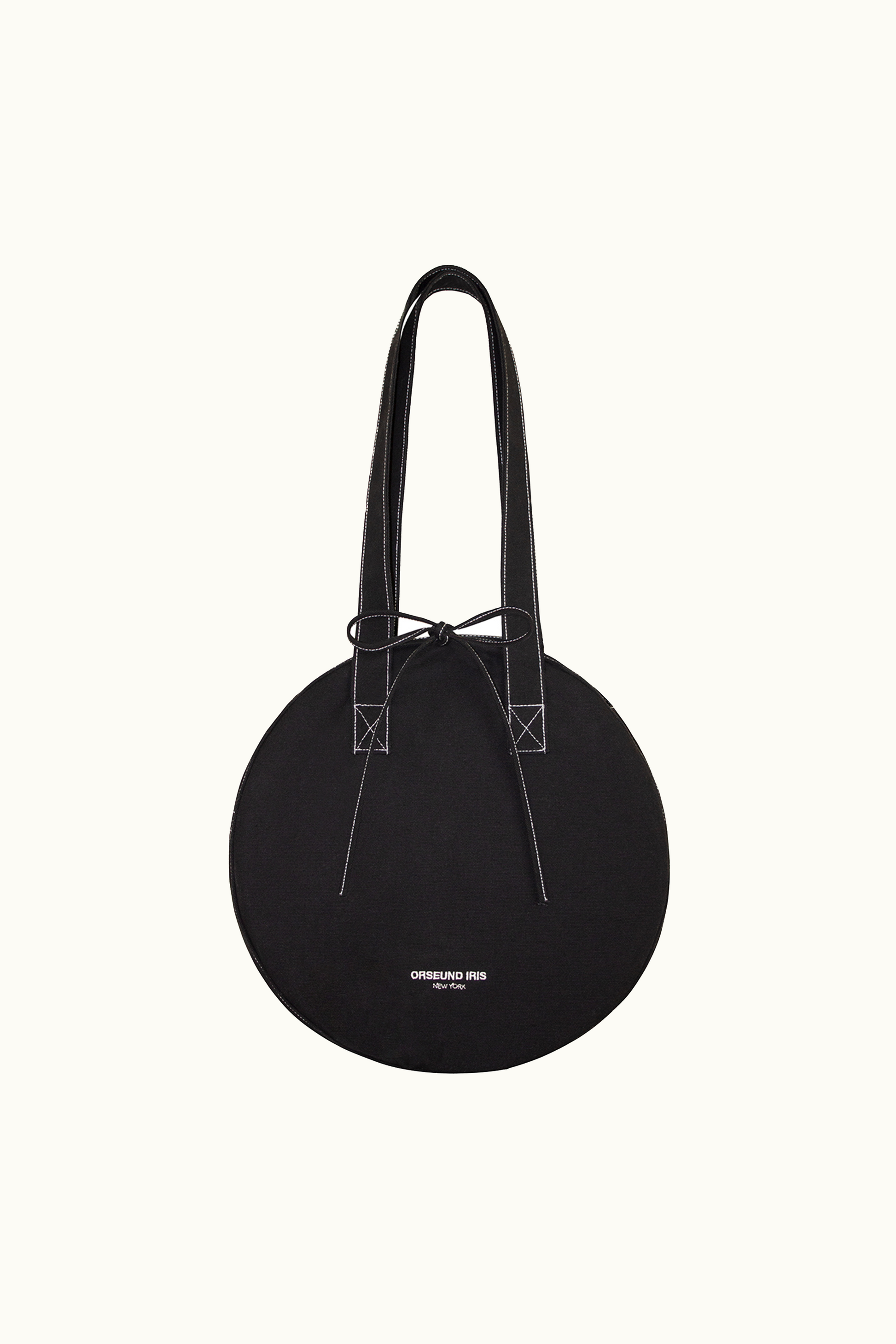 Orseund Iris signature Canvas Circle Tote with contrast top-stitch. Constructed with heavy-weight canvas and an interior binding for extra structure. Interior pocket to carry your essentials. Embroidered Orseund Iris logo at center front. Finished with a coating to repel dust and dirt. Resistant to some lint and fading. 15" diameter.