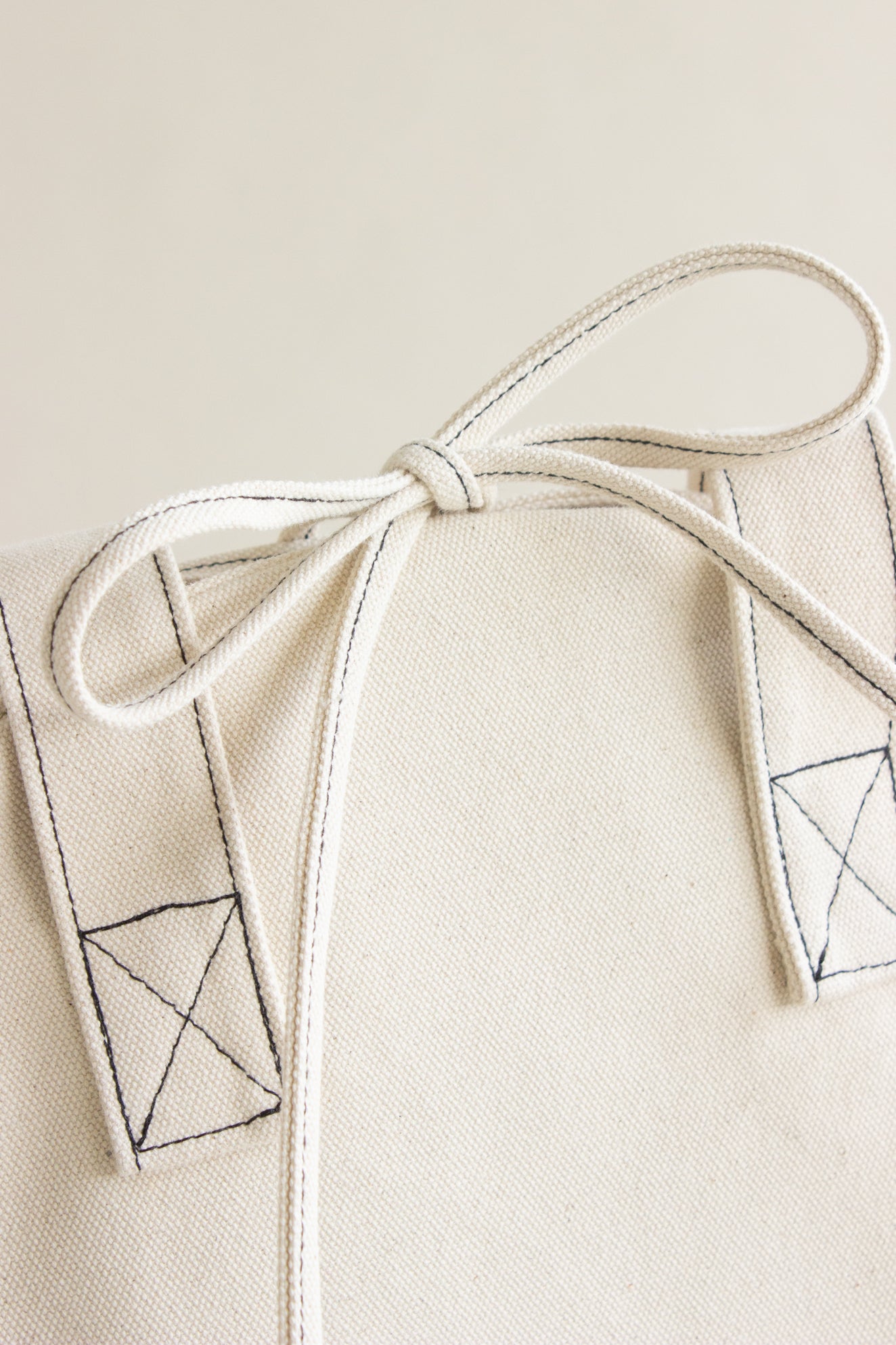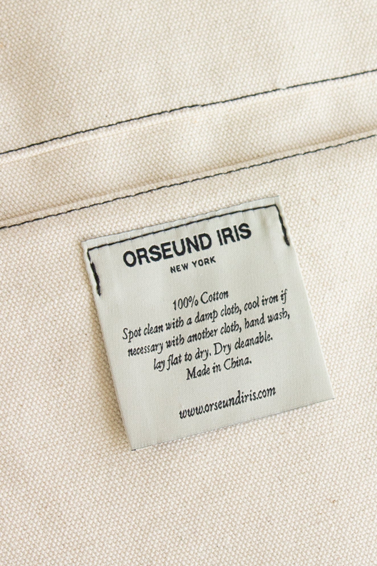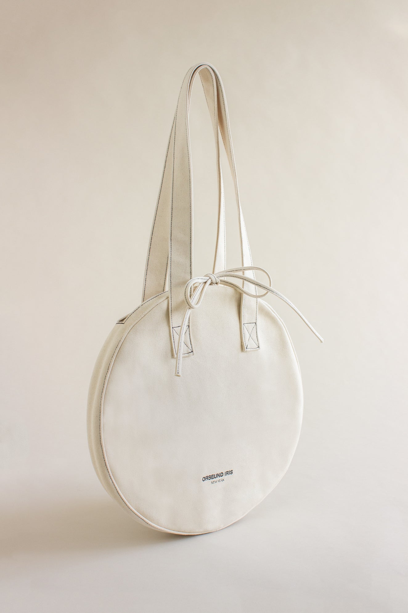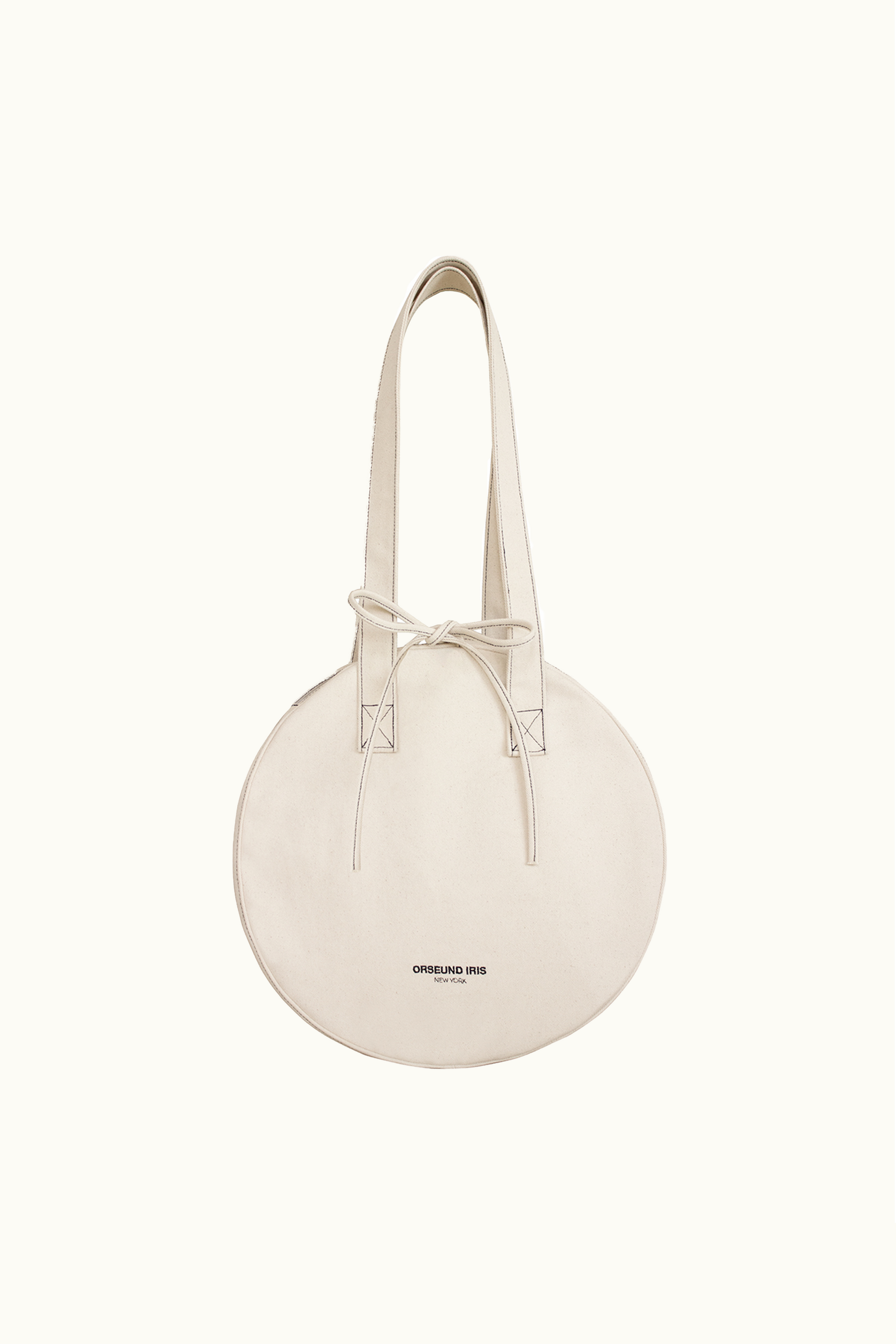 Orseund Iris signature Canvas Circle Tote with contrast top-stitch. Constructed with heavy-weight canvas and an interior binding for extra structure. Interior pocket to carry your essentials. Embroidered Orseund Iris logo at center front. Finished with a coating to repel dust and dirt. Resistant to some lint and fading. 15" diameter.