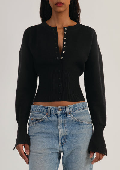 A crisp yet cozy chunky Milano knit blend of luxurious cotton and silk, this cardigan sweater adds volume at the shoulders and cinches at the waist. Made intentionally with long, dramatized sleeves.