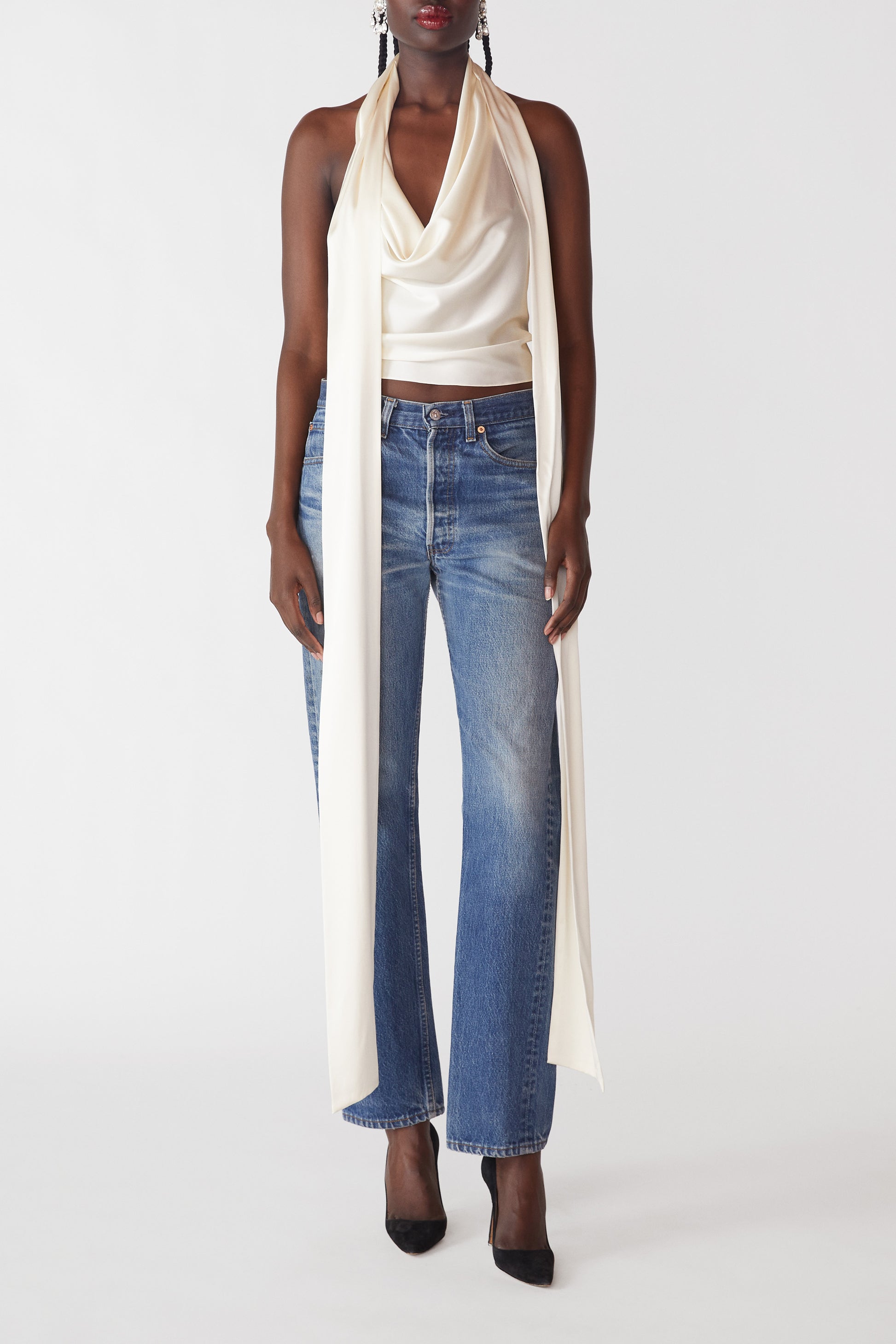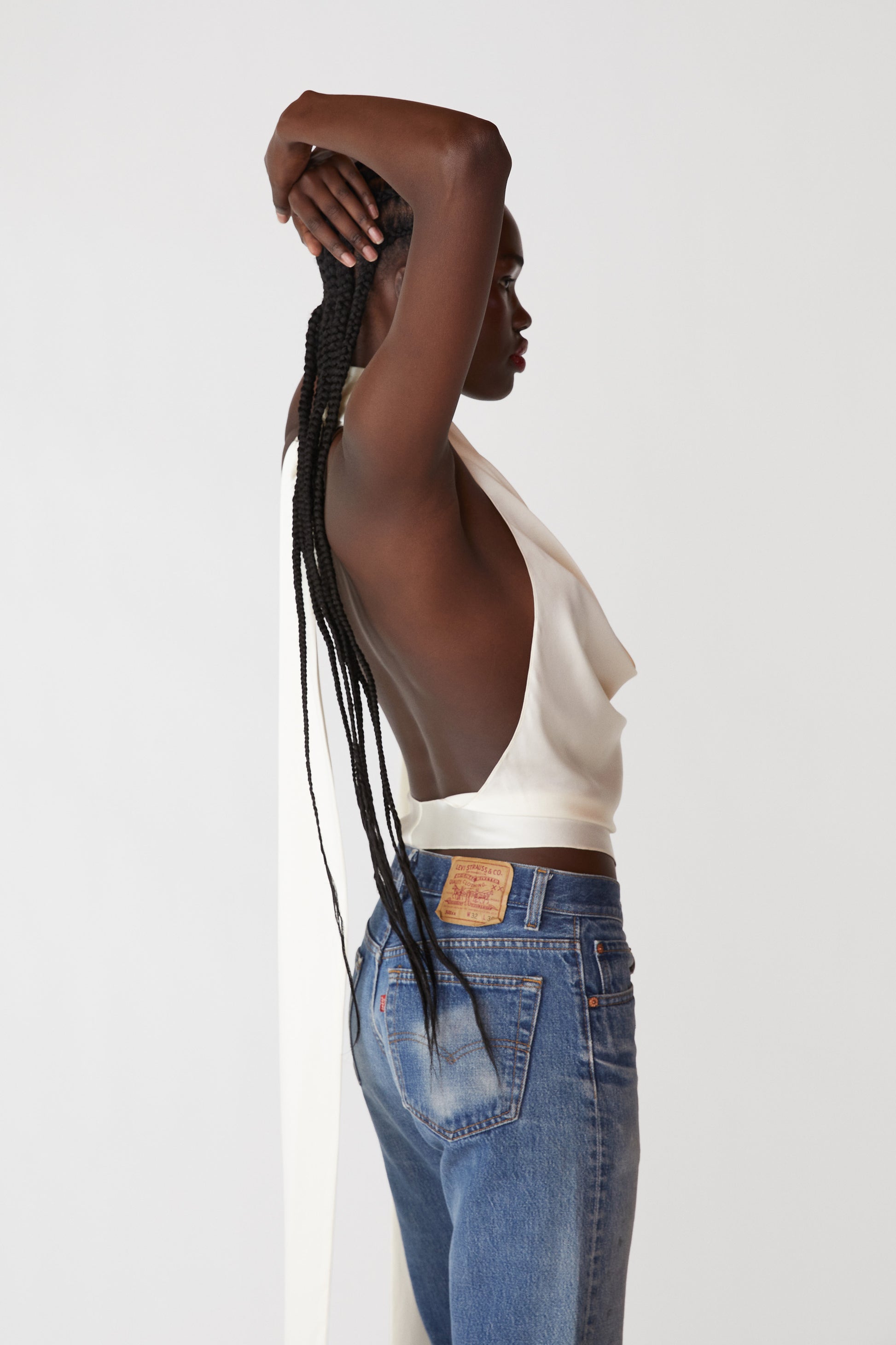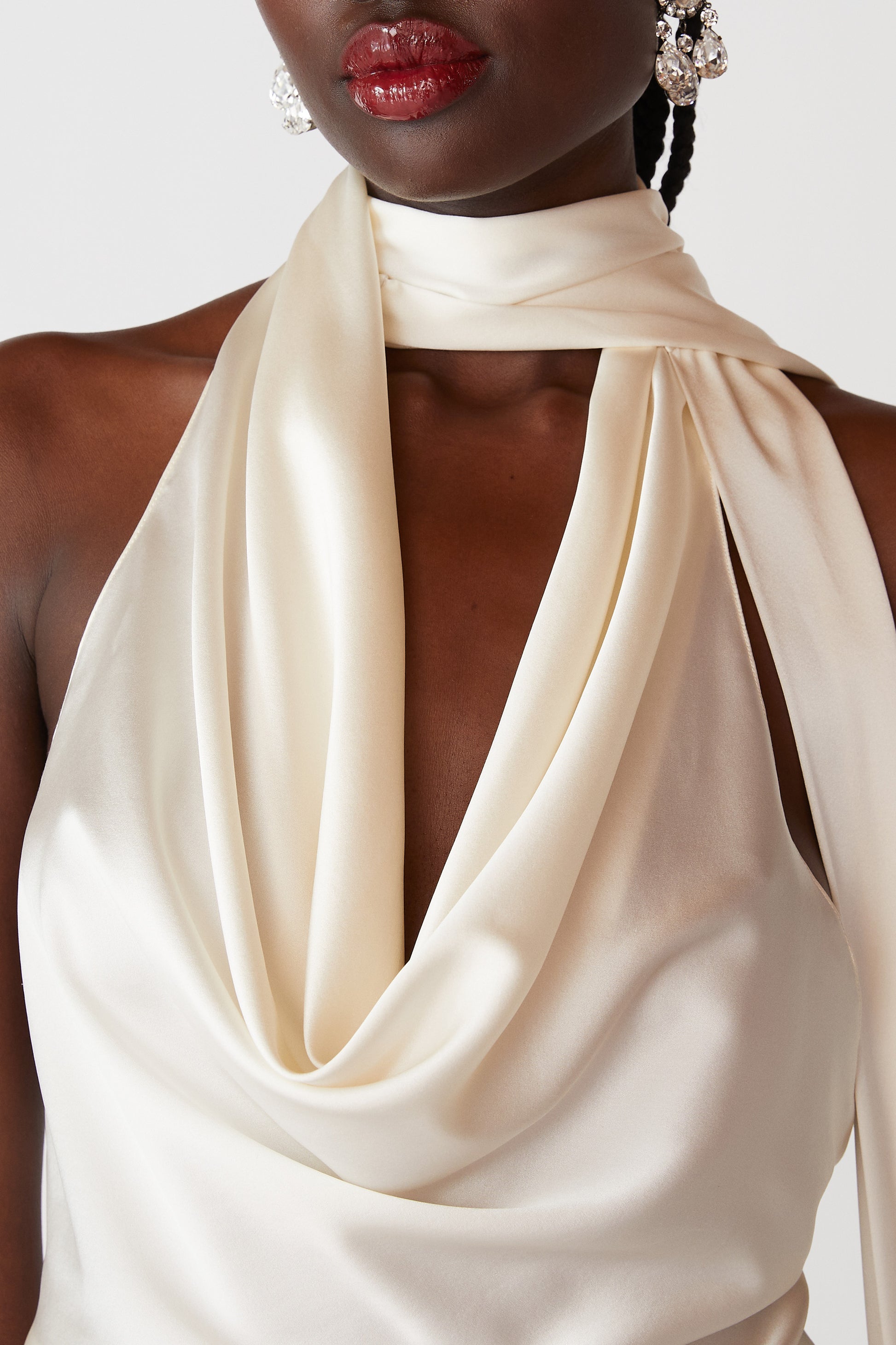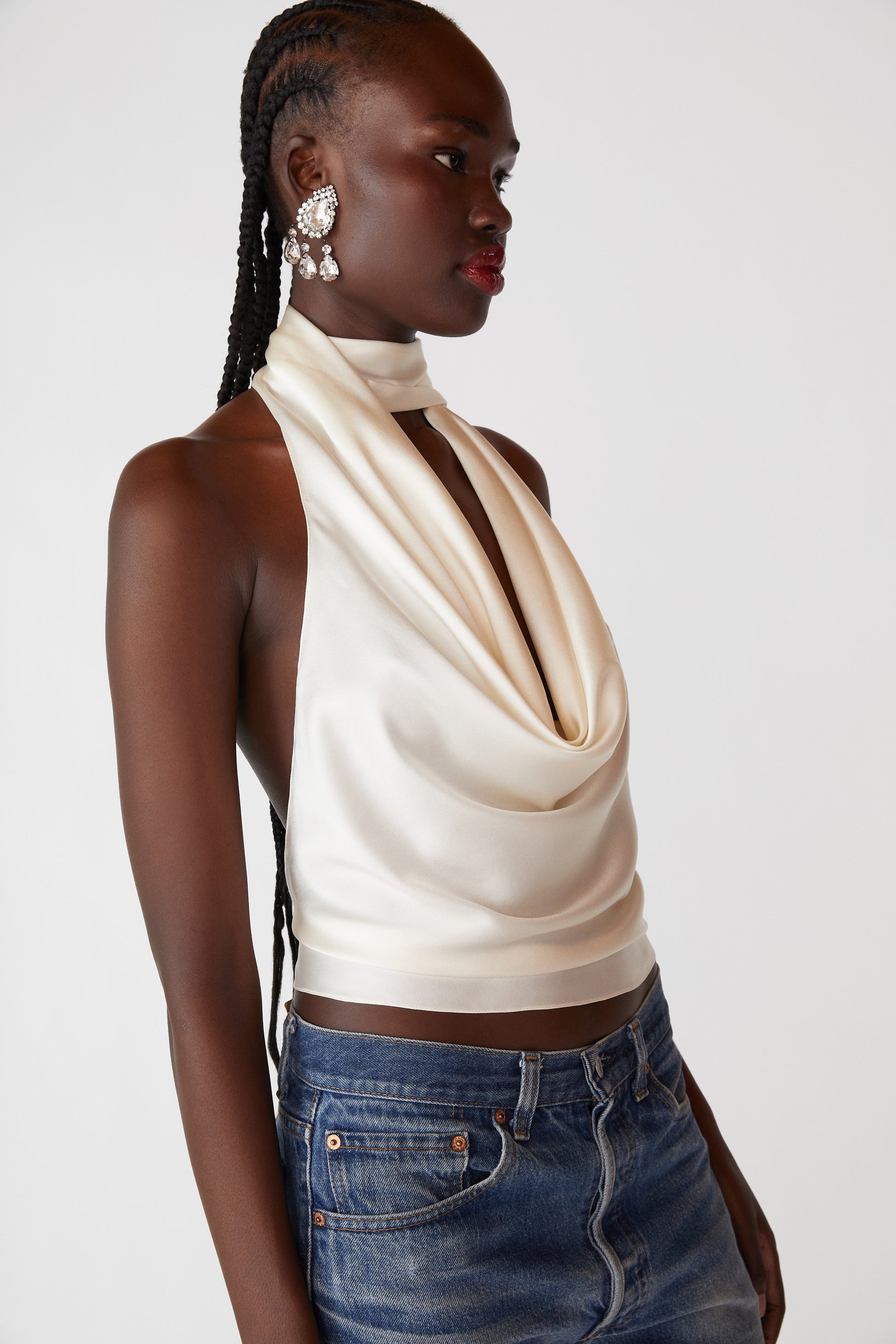 The shoulder-flattering cut and the elegant draping of a deep cowl neckline, this convertible top can be worn in a myriad of ways. Made from sultry silk, it’s the long, oversized bow that drapes your back and brings the drama.