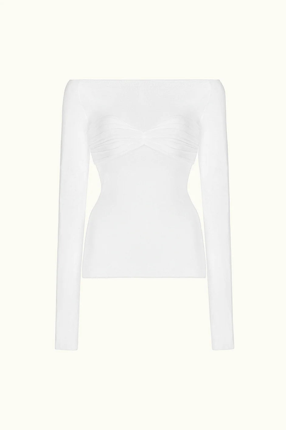 A dreamy, delicate, off-the-shoulder knit top. Features elegant hand-stitched ruching at the bust and extra long, light weight sleeves. For more coverage at the bust, size up. Please note this fabric is very delicate, we do not recommend wearing with any jewelry or thick layers that could snag or pull on the fabric.