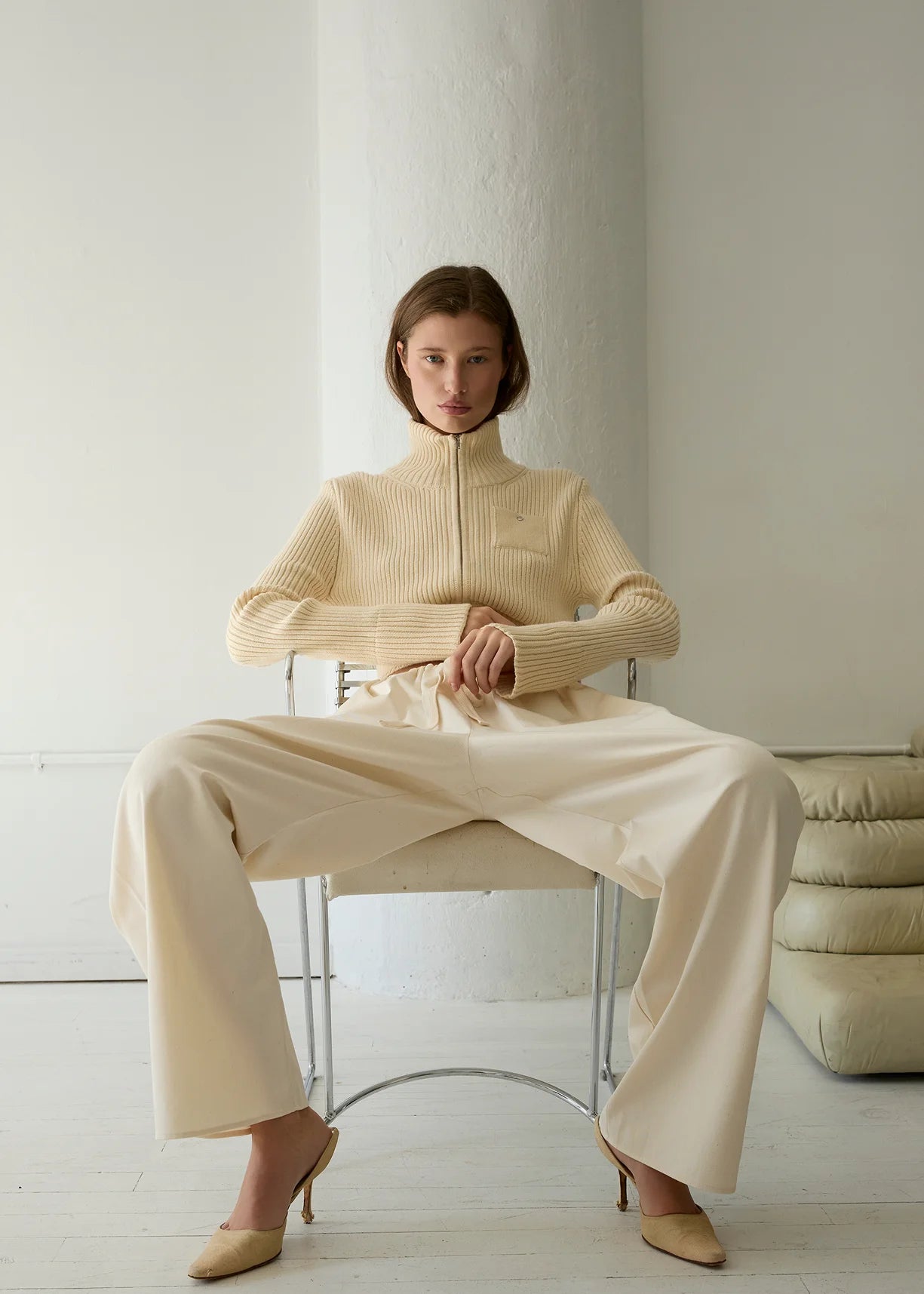 A dreamy, delicate, off-the-shoulder knit top. Features elegant hand-stitched ruching at the bust and extra long, light weight sleeves. For more coverage at the bust, size up. Please note this fabric is very delicate, we do not recommend wearing with any jewelry or thick layers that could snag or pull on the fabric.