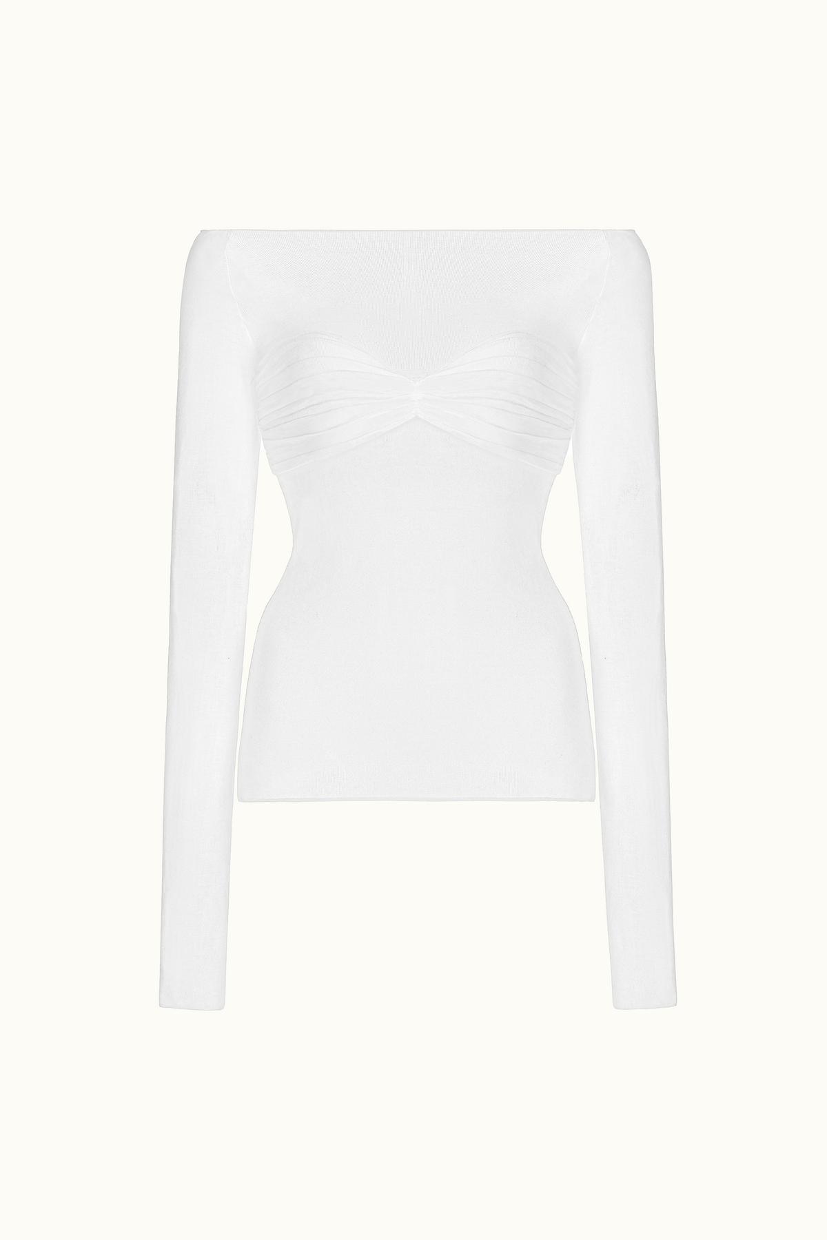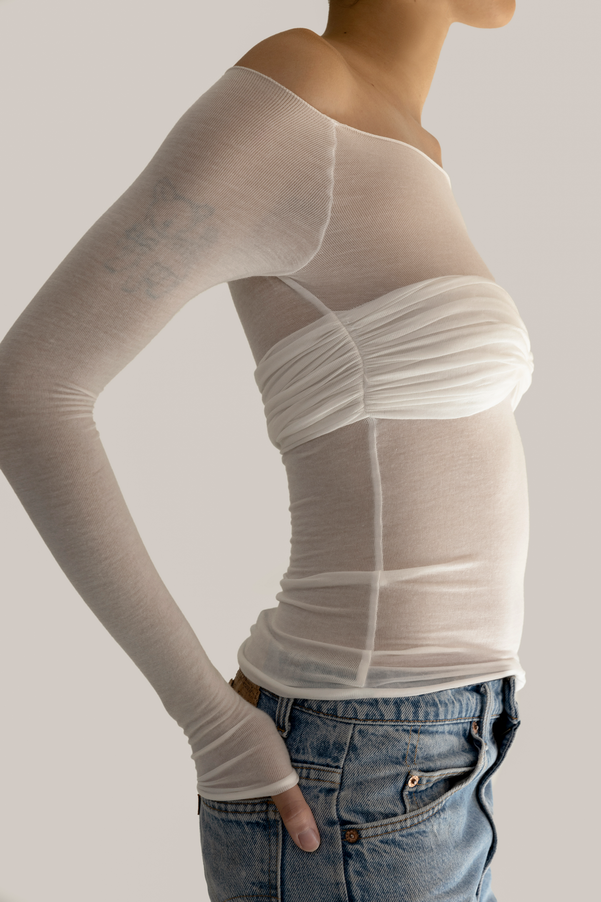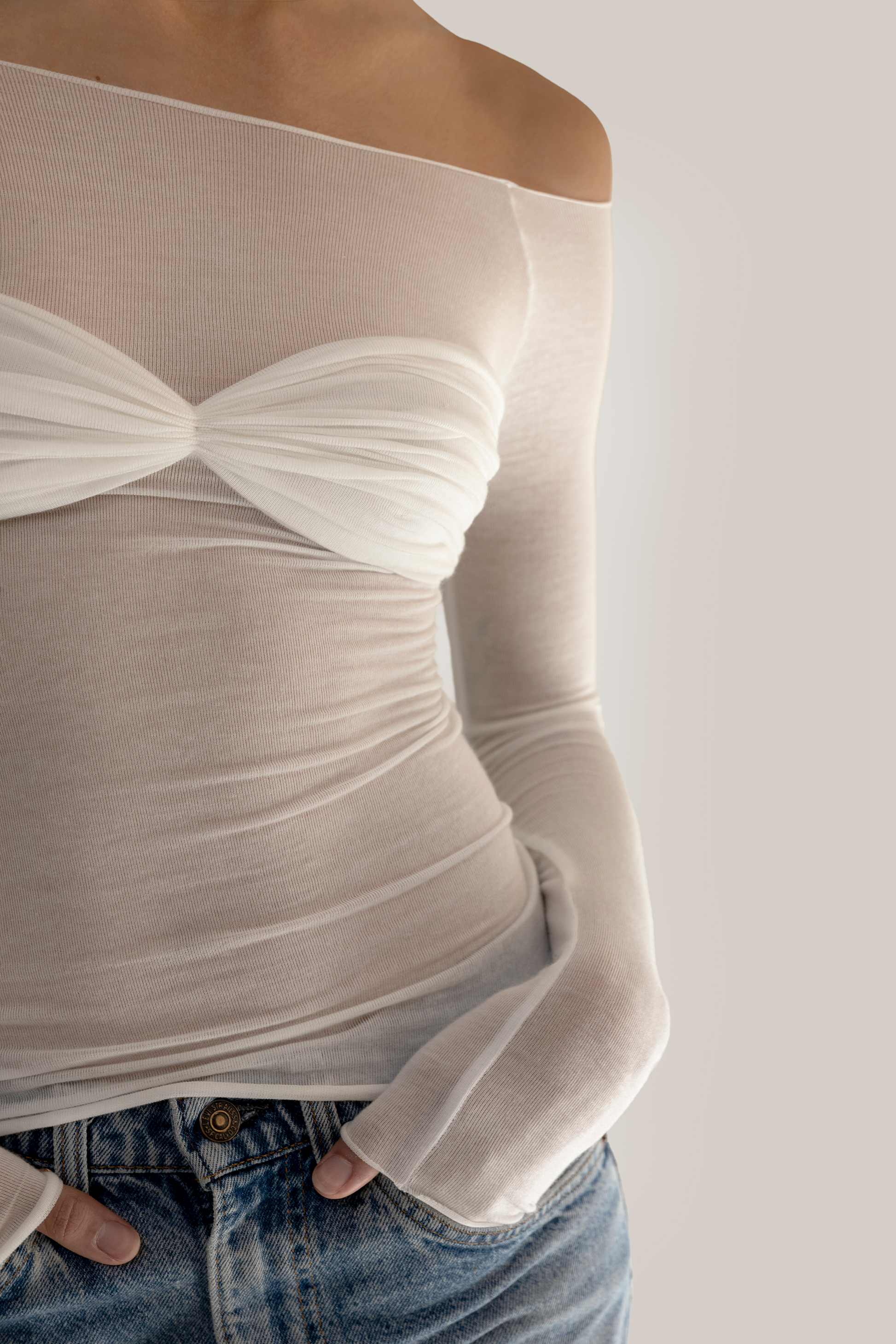 A dreamy, delicate, off-the-shoulder knit top. Features elegant hand-stitched ruching at the bust and extra long, light weight sleeves. For more coverage at the bust, size up. Please note this fabric is very delicate, we do not recommend wearing with any jewelry or thick layers that could snag or pull on the fabric.
