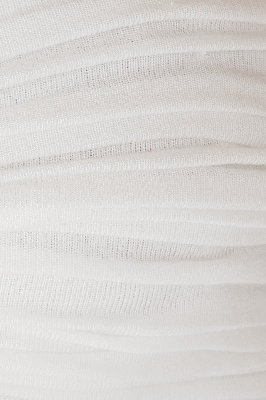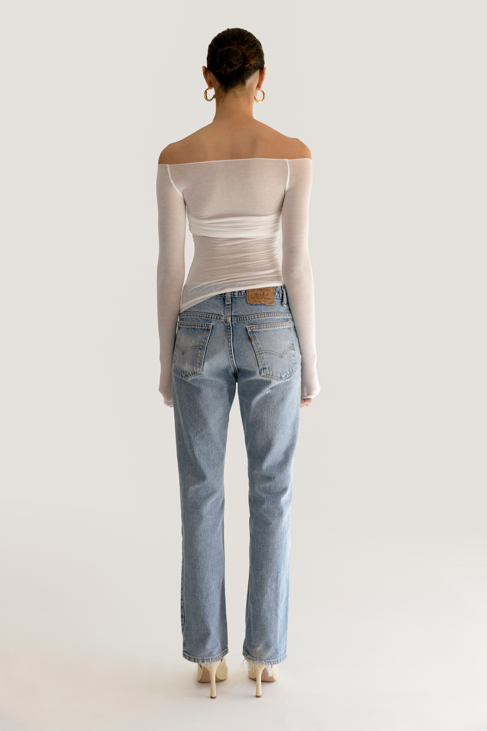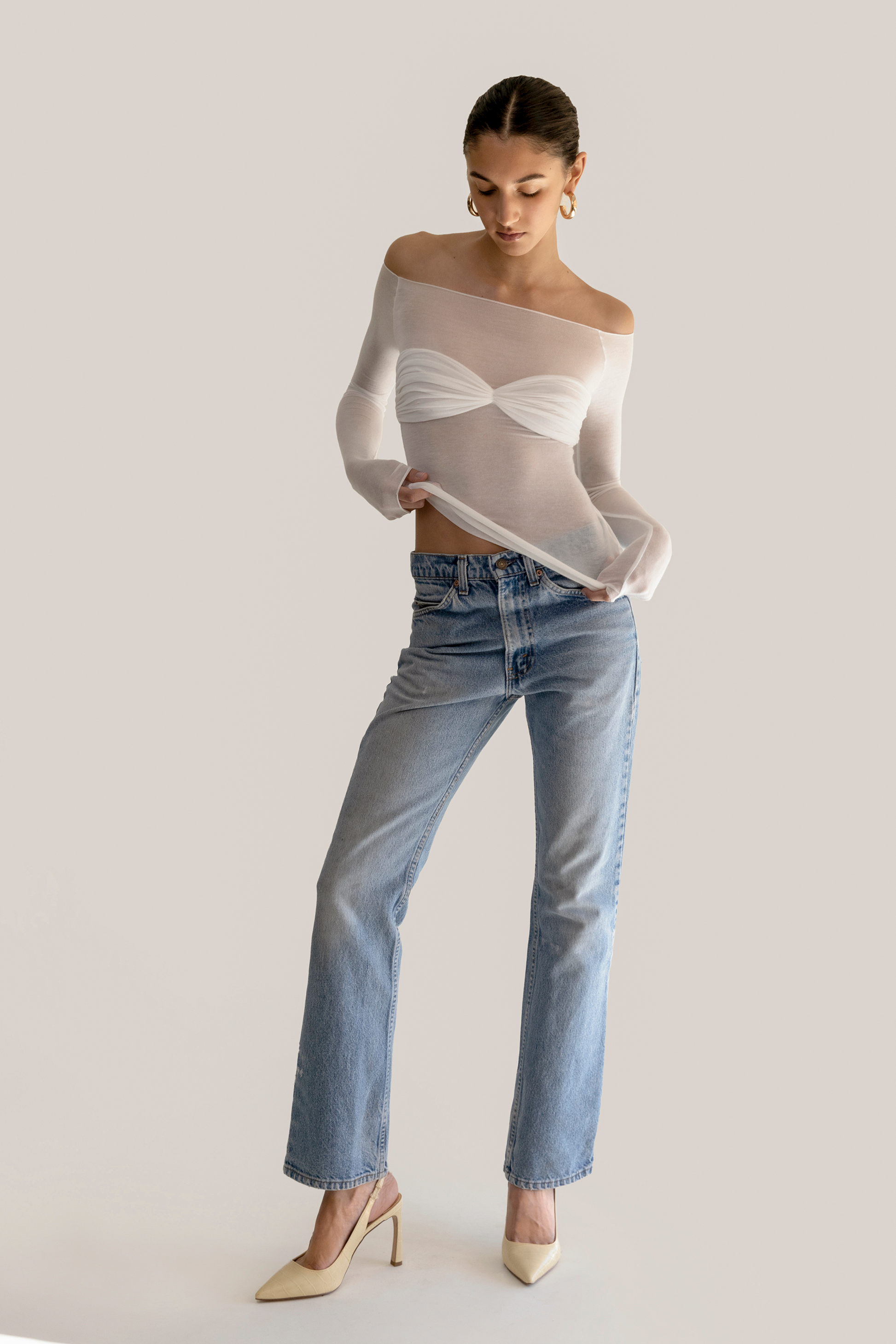 A dreamy, delicate, off-the-shoulder knit top. Features elegant hand-stitched ruching at the bust and extra long, light weight sleeves. For more coverage at the bust, size up. Please note this fabric is very delicate, we do not recommend wearing with any jewelry or thick layers that could snag or pull on the fabric.