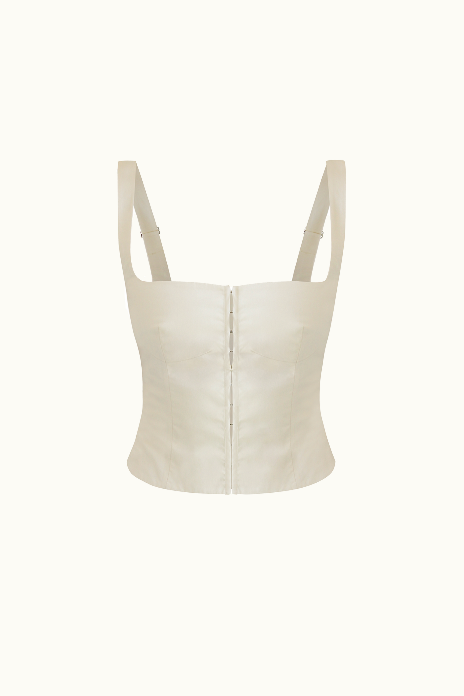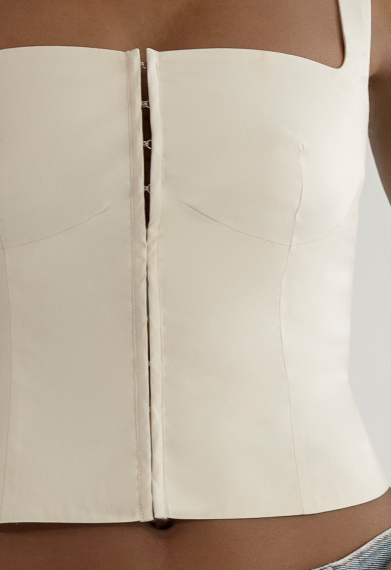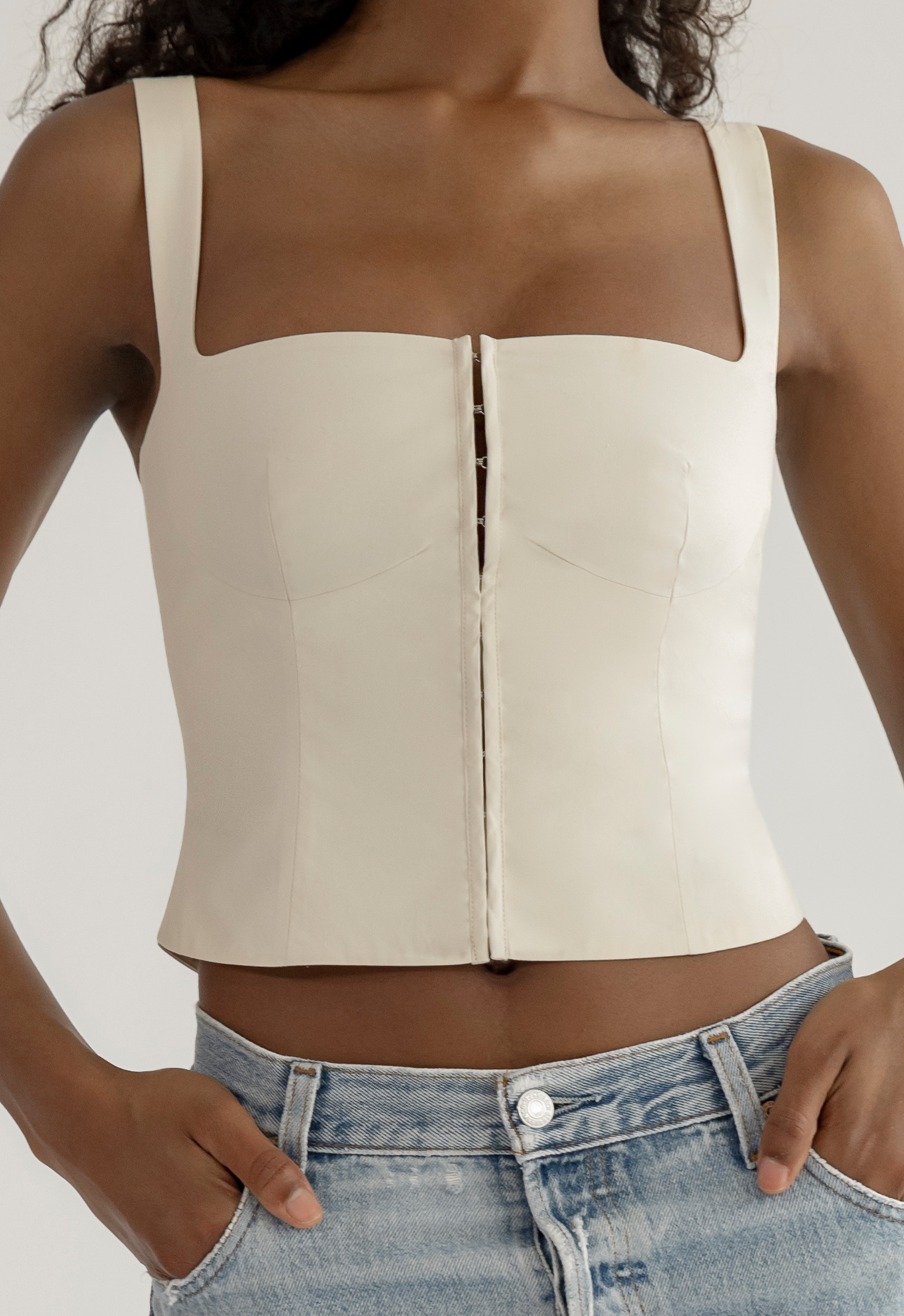 Better than a predictable tee or that same old tank, this modern day casual bustier top features a square neckline and 11 hand-sewn hook and eye closures running down the front. Now with adjustable straps for the perfect fit.