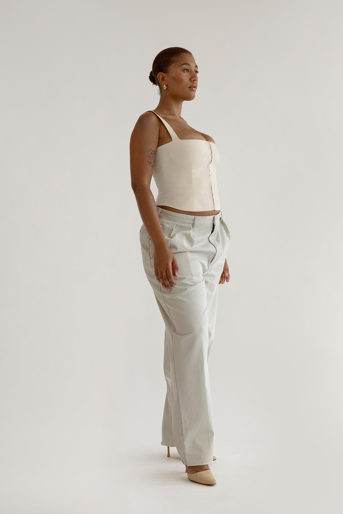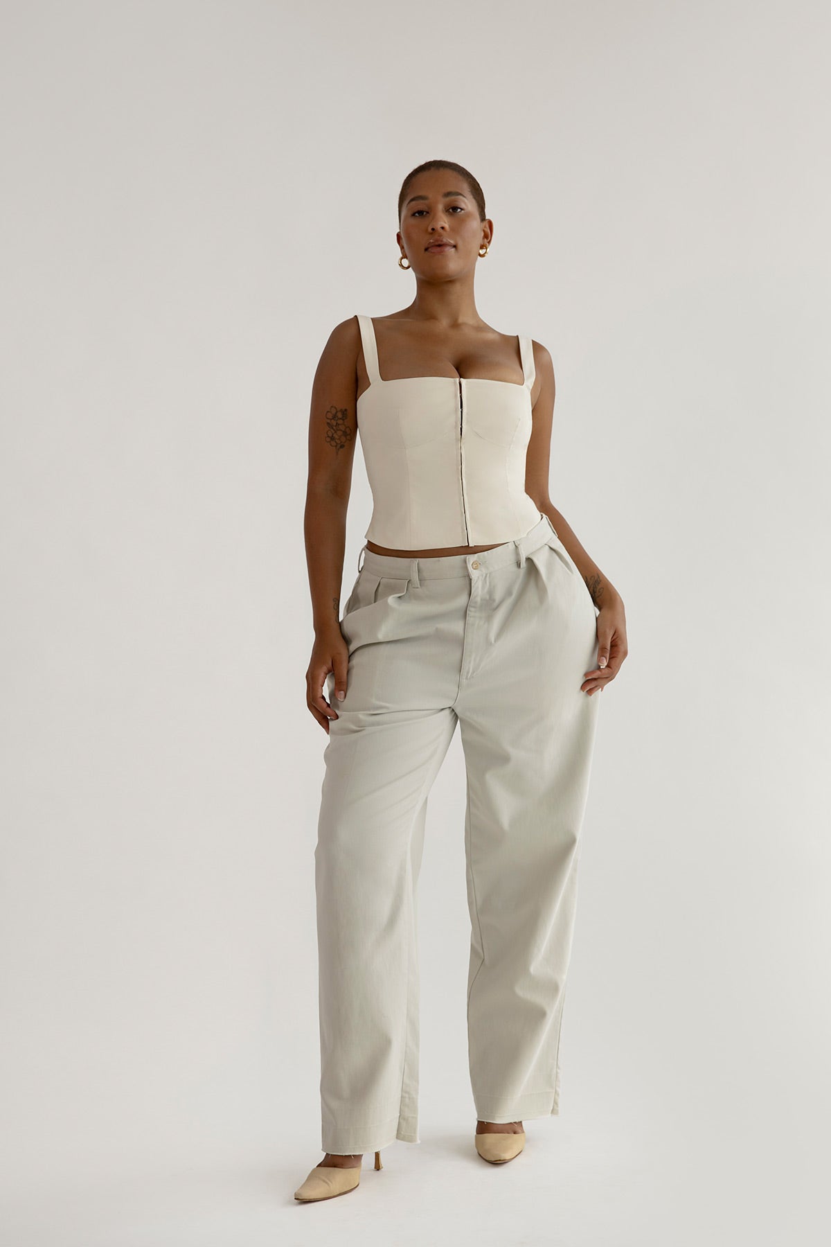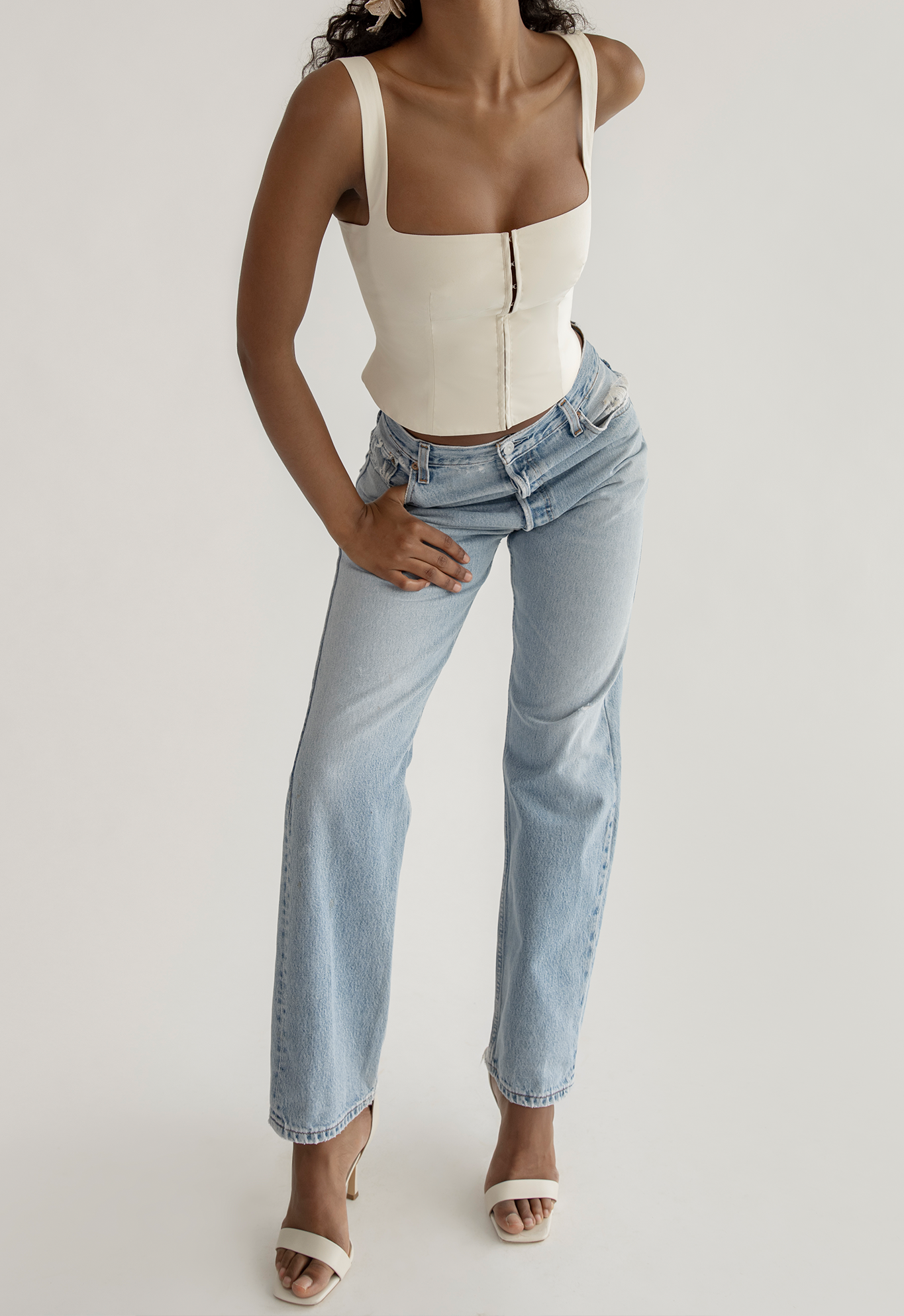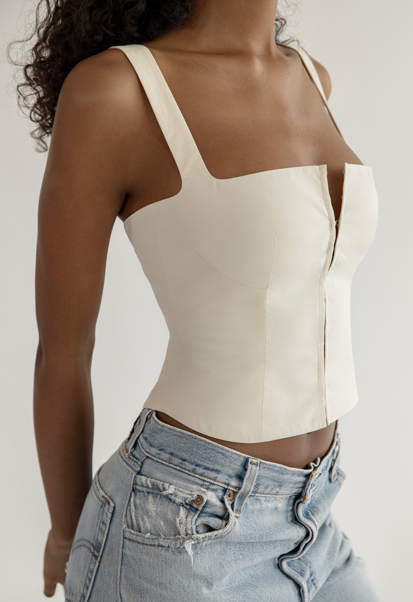Better than a predictable tee or that same old tank, this modern day casual bustier top features a square neckline and 11 hand-sewn hook and eye closures running down the front. Now with adjustable straps for the perfect fit.