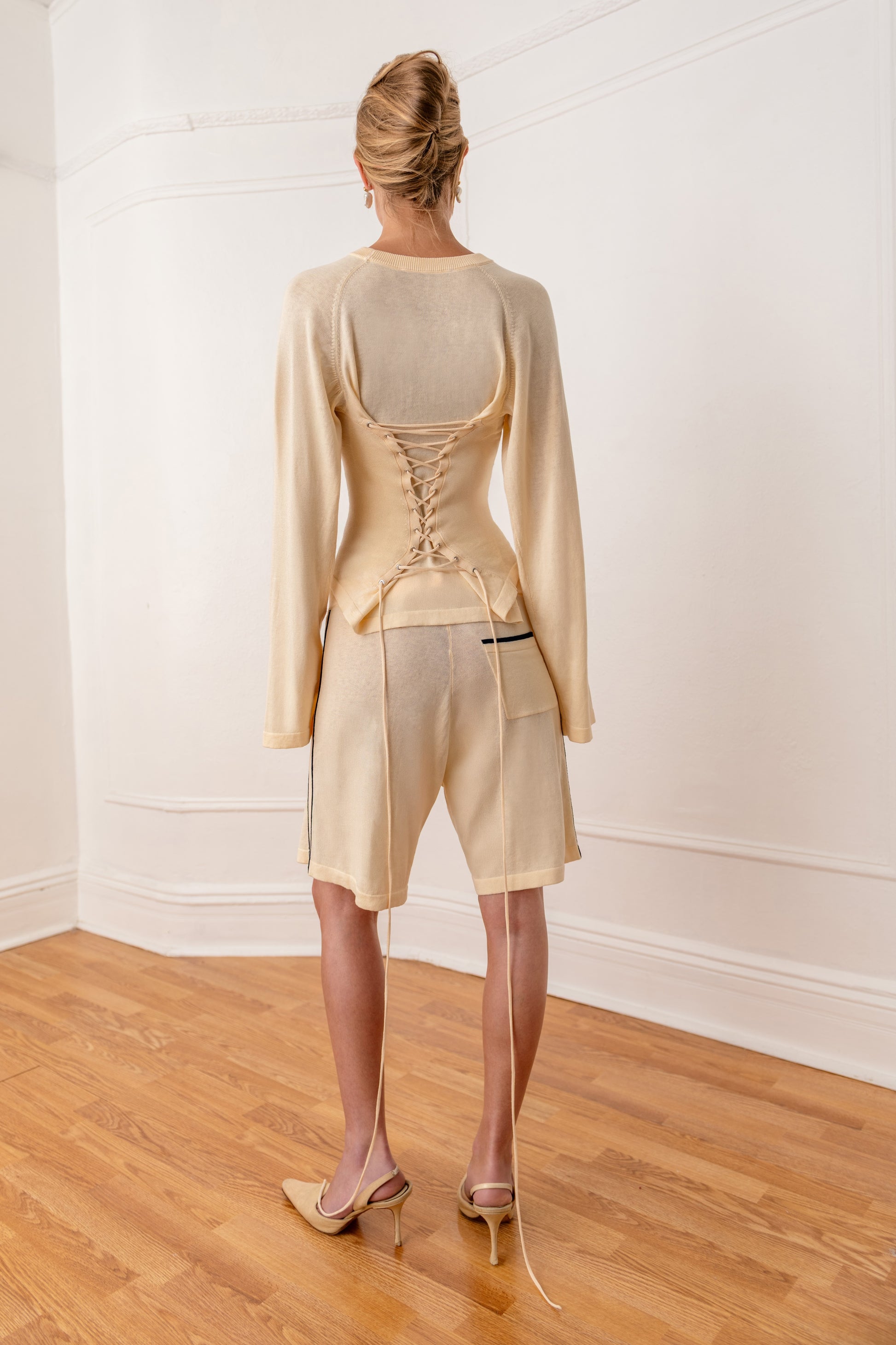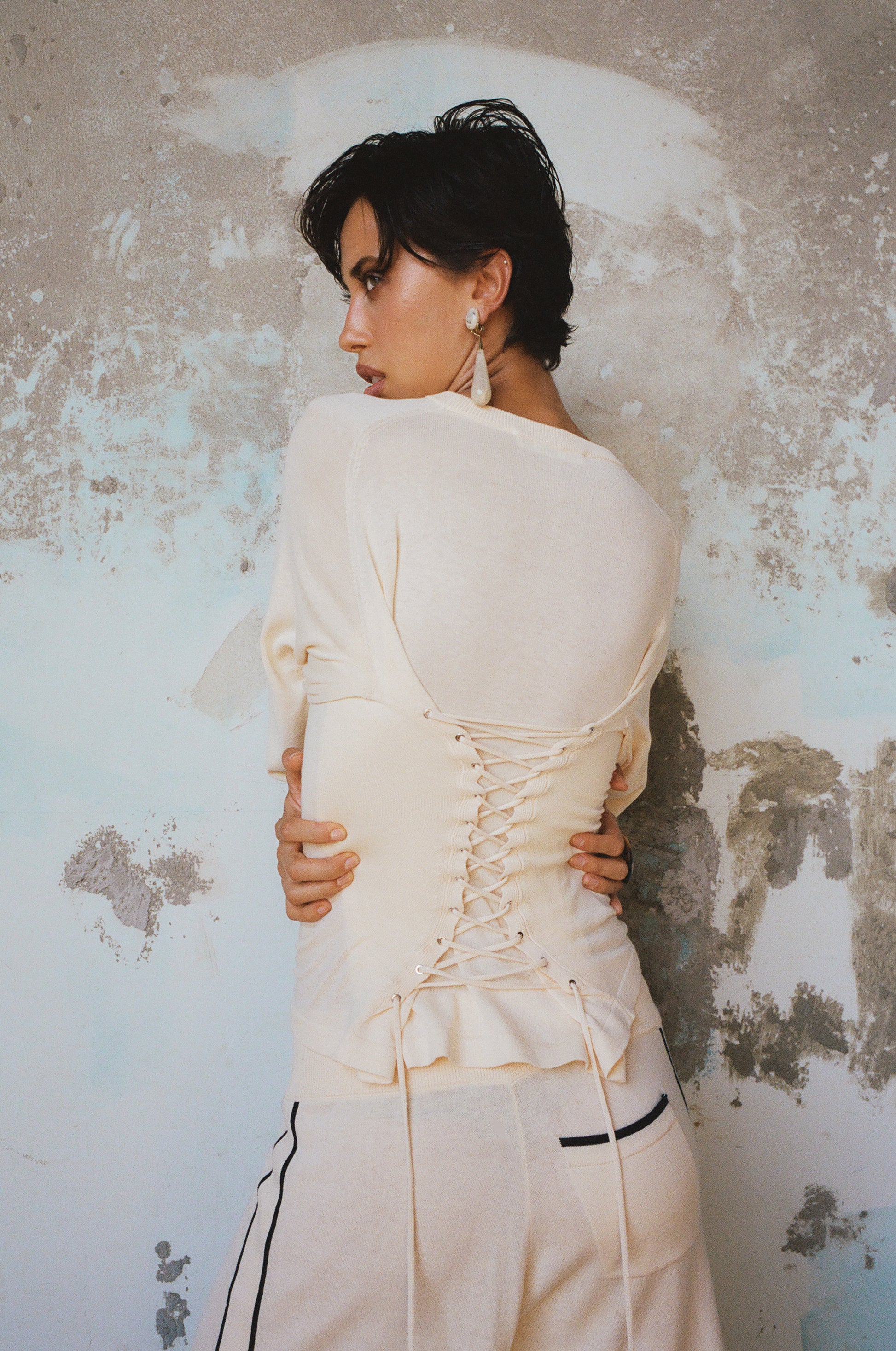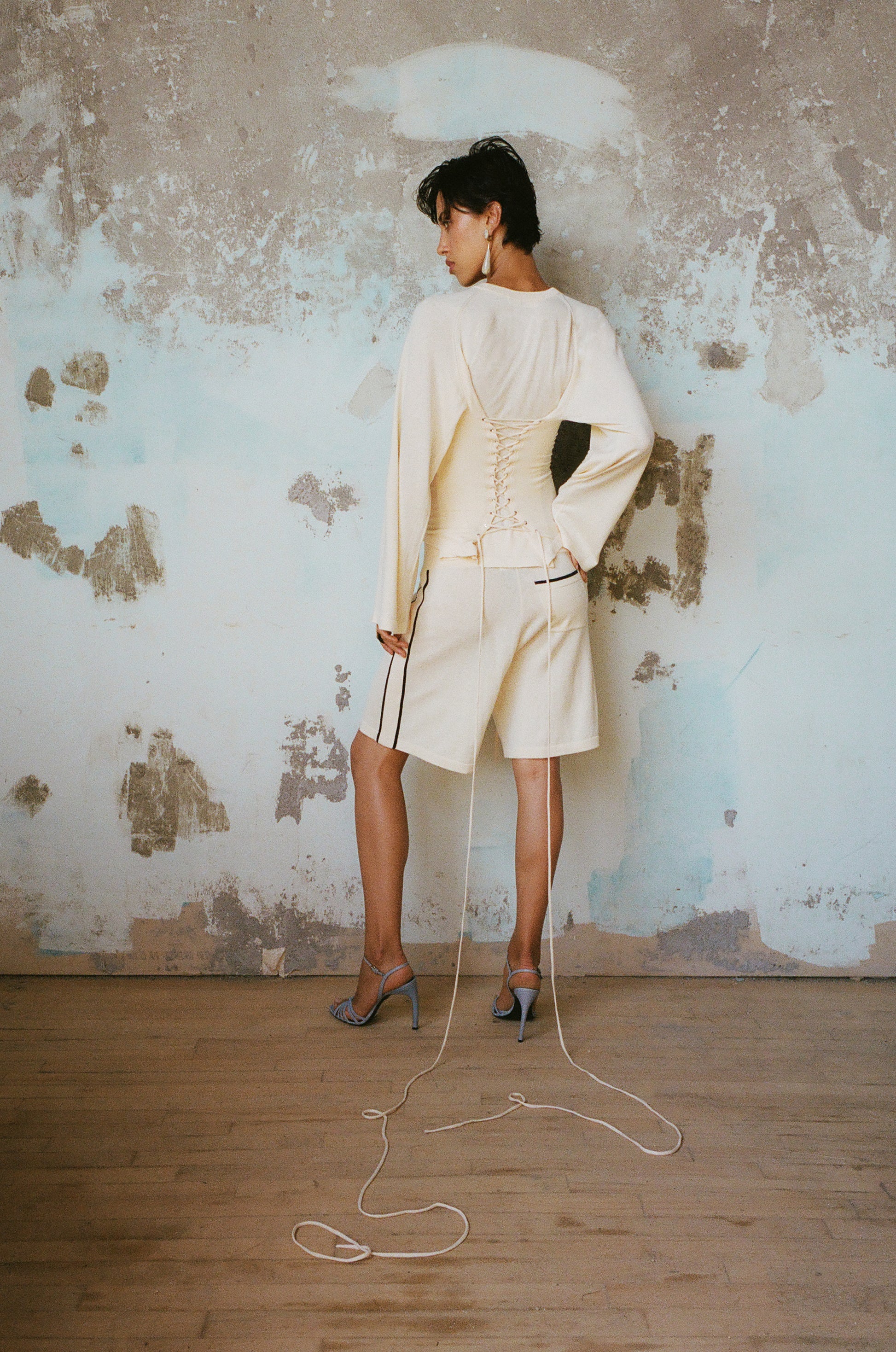Sporty and feminine, this reversible raglan shirt is inspired by vintage American heritage sportswear. A corset-inspired lace-up cinches the waist whether worn front or back, balancing athletic edge with effortless femininity. Crafted from a soft cotton and silk blend that mimics the broken-in feel of a well-loved vintage jersey, it’s as comfortable as it is polished. Finished in timeless navy and antique cream.
