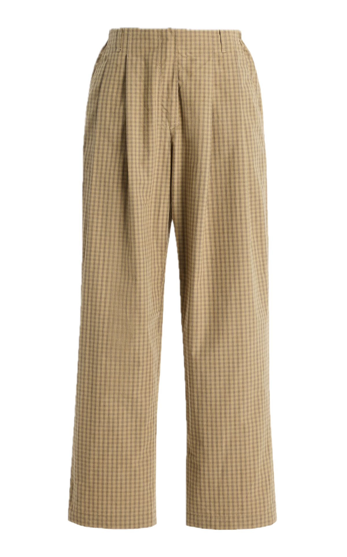 A low-rise, intentionally oversized tailored trouser, made from a crisp cotton poplin. Crafted in a classic tan and muted black plaid, these trousers feature pockets, invisible clasp, single seam pleats, and elasticated waist band on each side of the hip. This pant is a straight leg cut with a slight taper. Designed to be worn as a set, or pair effortlessly with both casual and more refined separates.