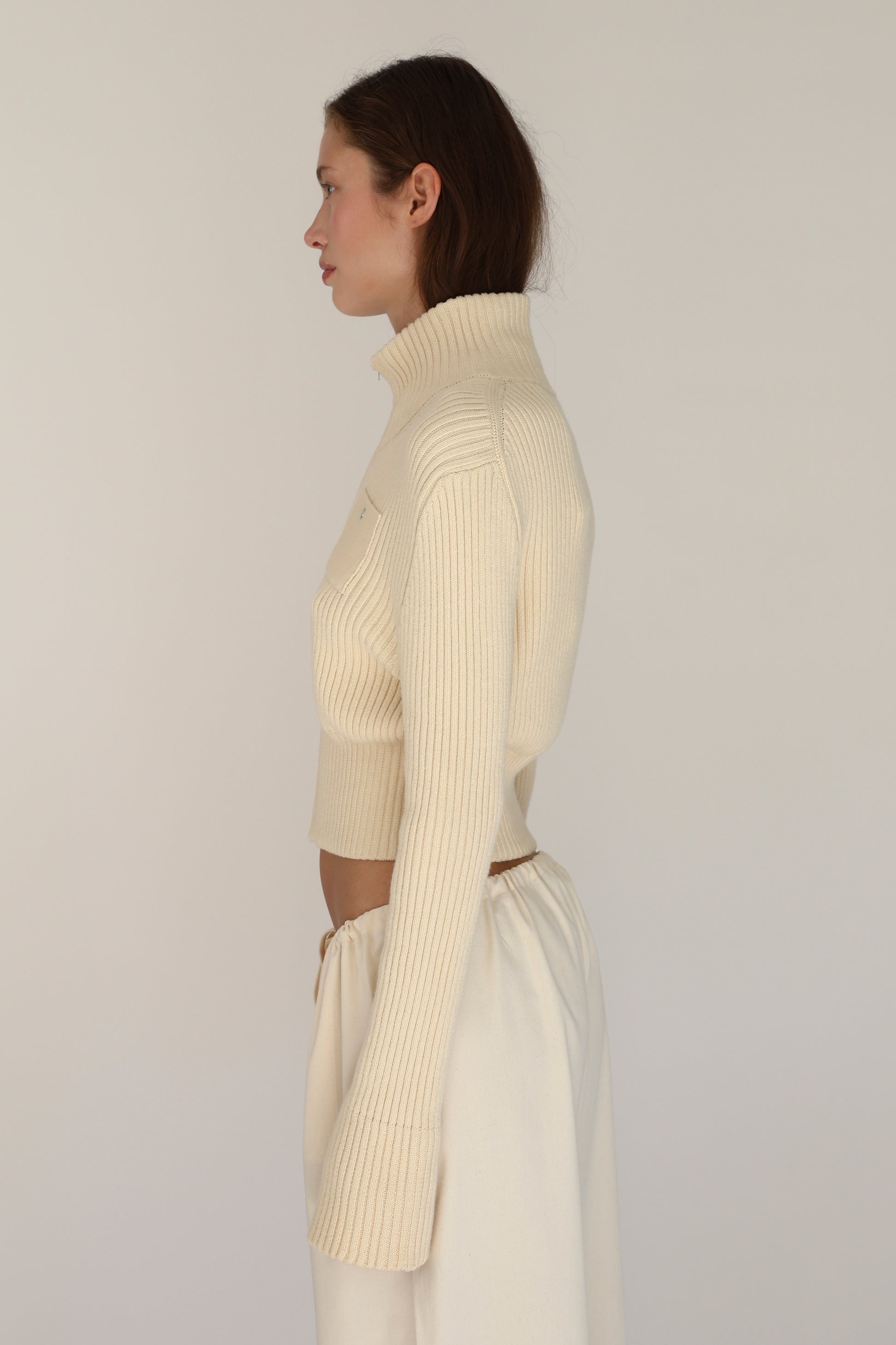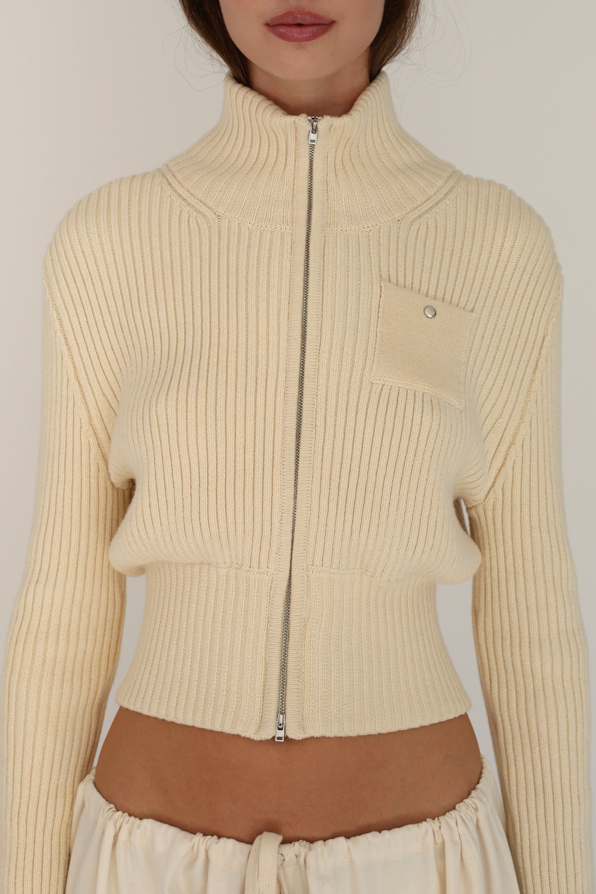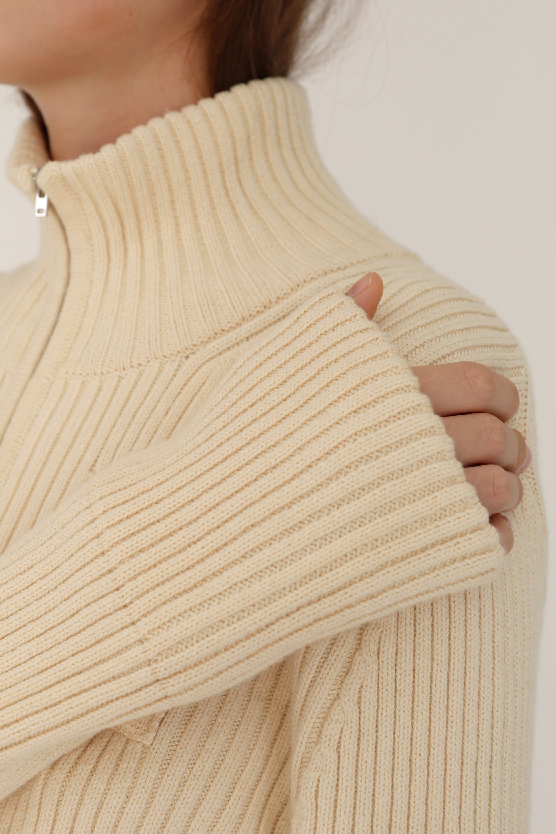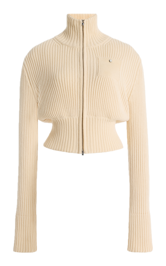 A refined essential with everyday ease. This zip-up is crafted from a soft cotton-cashmere blend for lightweight warmth and comfort. Designed with a two-way zipper for versatile styling, this knit features an exaggerated length cuff and square pocket detail on the left chest.